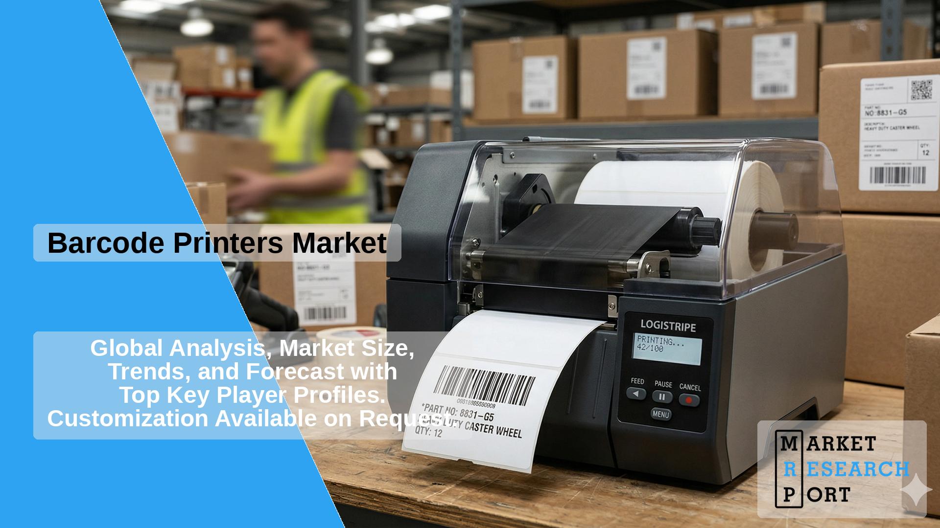 The market is segmented into industrial, desktop, and mobile barcode printers. Industrial printers lead in volume, while mobile printers are seeing the fastest adoption.