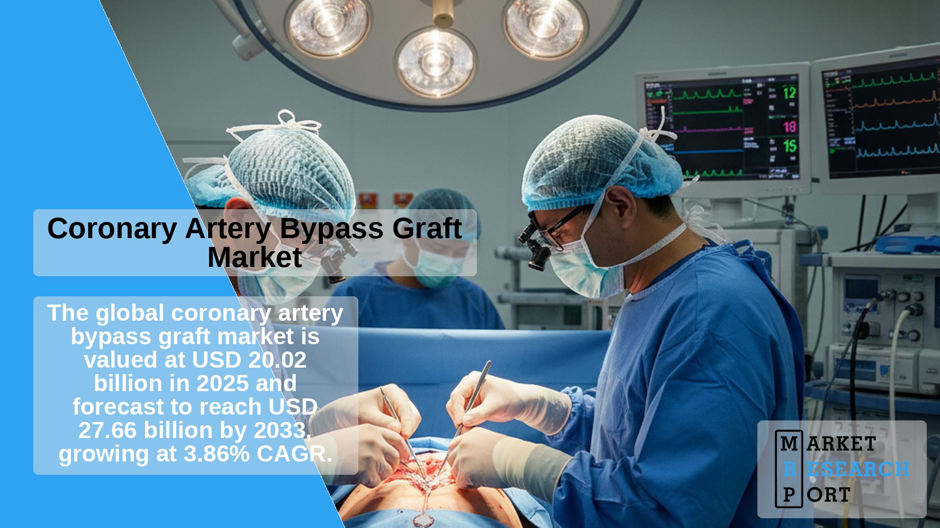 The global coronary artery bypass graft (CABG) market was valued at approximately USD 20.43 billion in 2025 and is expected to reach USD 27.66 billion by 2033, with a compound annual growth rate (CAGR) of about 3.86% from 2025 to 2033. The increasing prevalence of cardiovascular diseases worldwide is a primary factor stimulating market expansion.