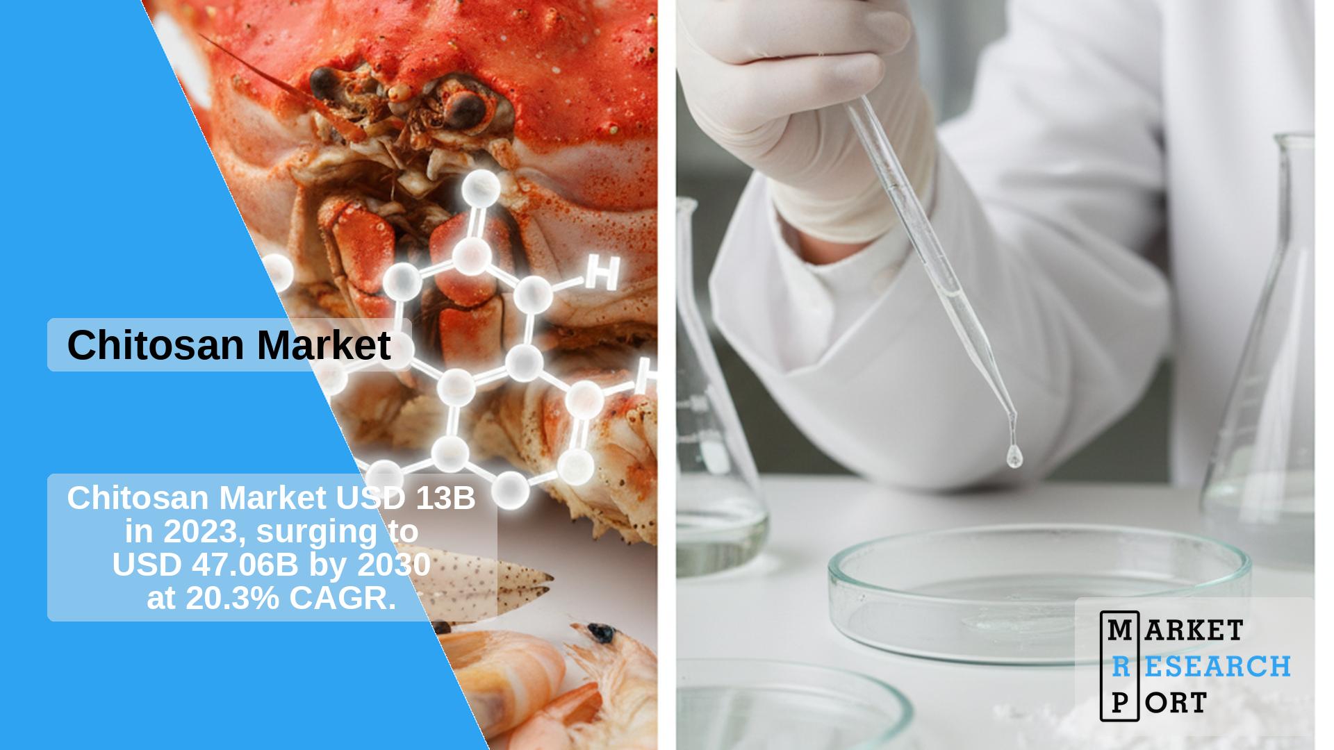 The global chitosan market was valued at USD 13.00 billion in 2023 and is projected to reach USD 47.06 billion by 2030, growing at a CAGR of 20.3% from 2024 to 2030. This growth is driven by increasing adoption of naturally derived products in wastewater treatment, pharmaceuticals, and cosmetics.
