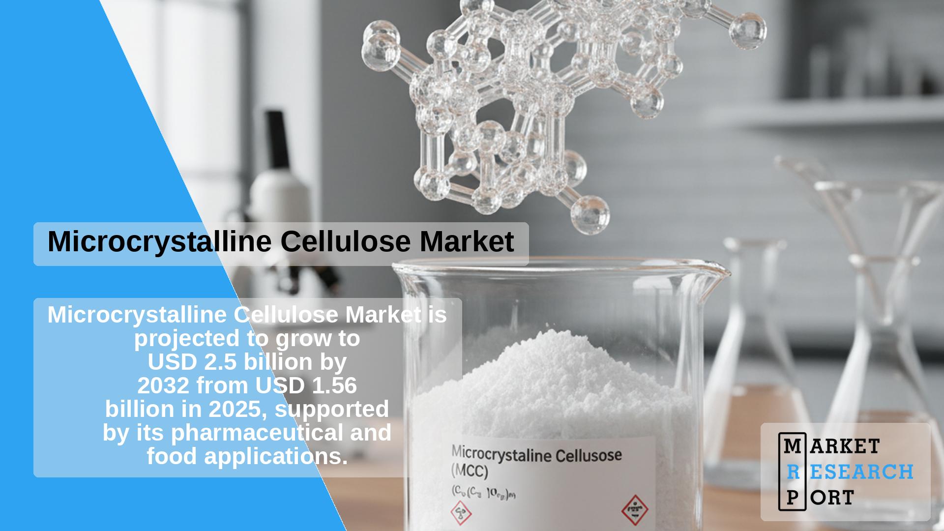 The global microcrystalline cellulose (MCC) market was valued at approximately USD 1.56 billion in 2025 and is projected to grow at a CAGR of around 7.0% from 2025 to 2032, reaching an estimated value of USD 2.5 billion. MCC is widely used as a binder, filler, and disintegrant in pharmaceutical tablets, as well as a bulking and anti-caking agent in food products.